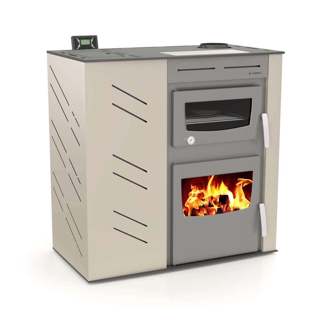 Υδραυλική θερµάστρα που συνδέεται µε το συστηµα του καλοριφέρ. Η θερµάστρα λειτουργεί µε ξύλο ή µε πέλλετ. Όταν η θερµοκρασία από την καύση του ξύλου πέφτει, αυτόµατα η θερµάστρα λειτουργεί µε pellet. Η θερµάστρα παρέχει αυτόµατη έναυση (τo pellet ανάβει τα ξύλα). Ο λειτουργικός σχεδιασµός του φούρνου καθιστά πιο εύκολο το µαγείρεµα. Η ισχύς της καύσης κι η ένταση του ανεµιστήρα µπορούν να ρυθµιστούν σε 5 διαφορετικά επίπεδα ανάλογα µε τις ανάγκες σας. ∆ιαθέτει χρονοδιακόπτη που καθορίζει την ώρα ενεργοποίησης κι απενεργοποίησης καθώς και τον τύπο λειτουργίας. ∆ιαθέτει εµαγιέ φούρνου, ταψί σχάρα και θερµόµετρο.